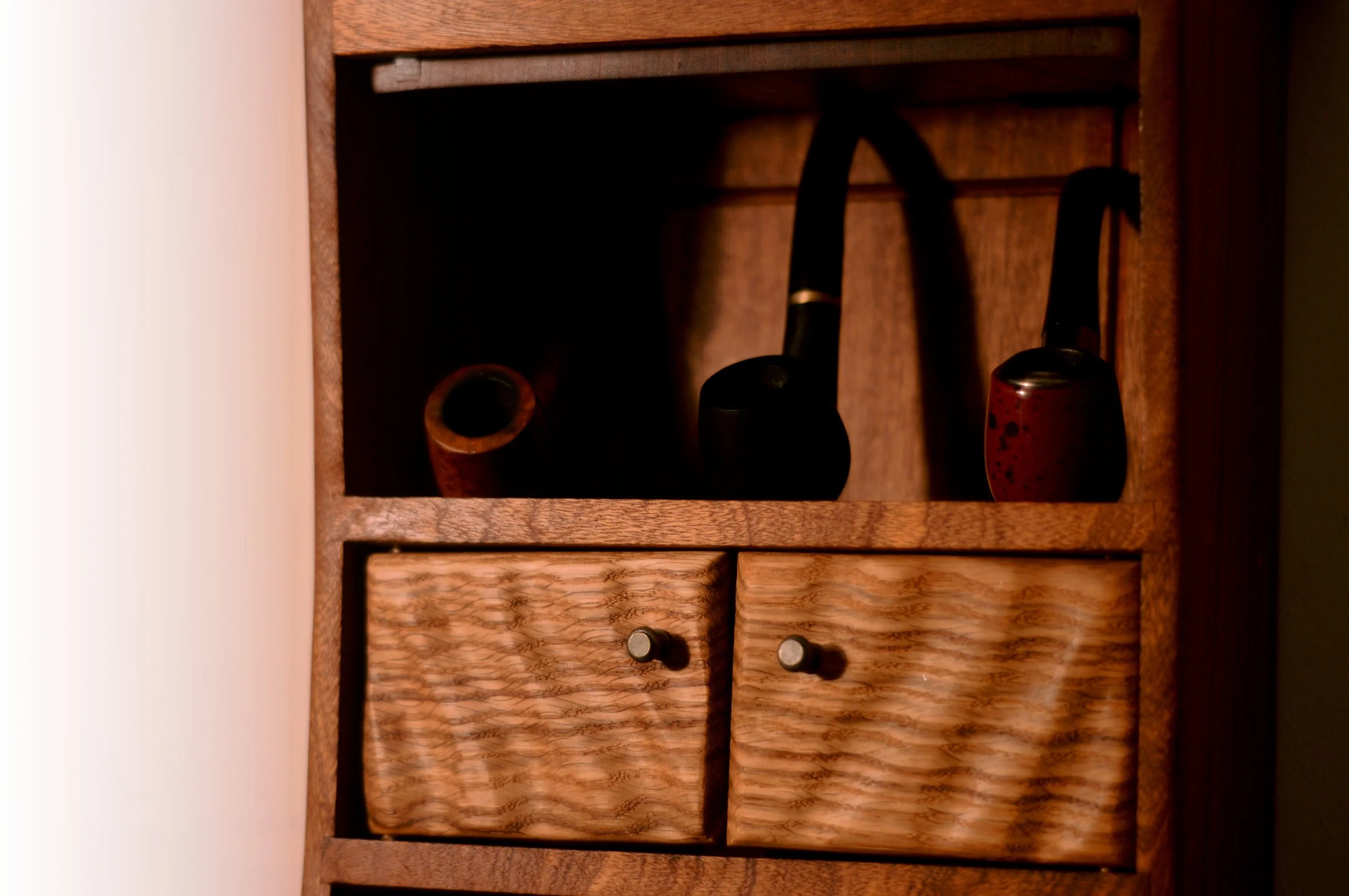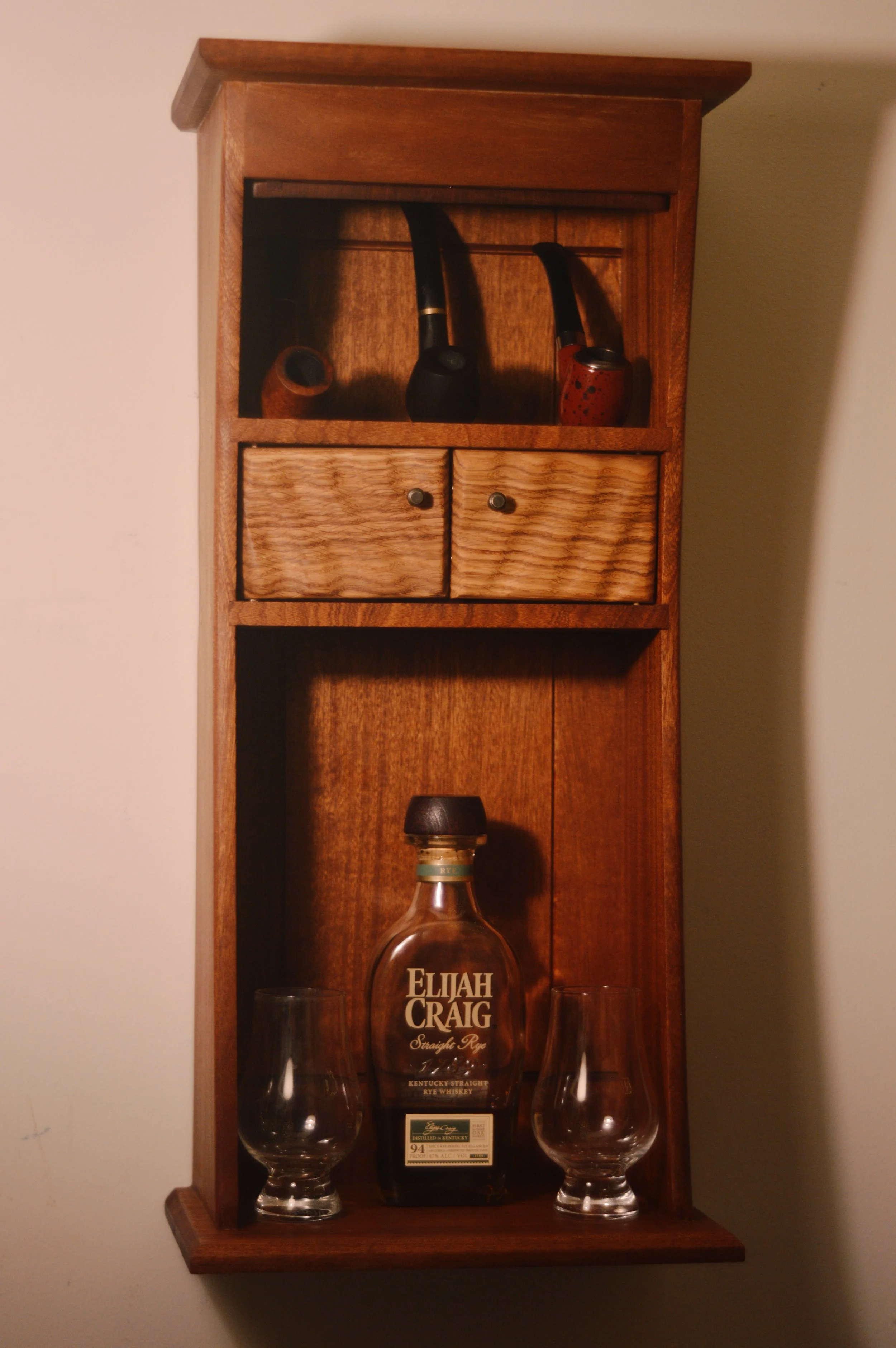 Wall-hanging shelf designed to house bottles, glasses, pipes, tobacco, cigars, et cetera.